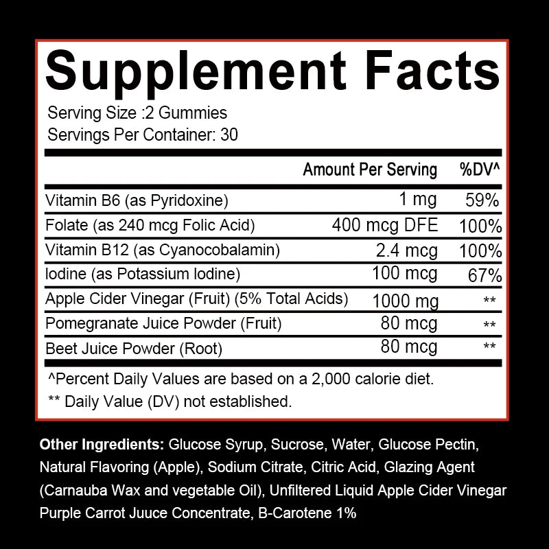 Get All the Benefits of Apple Cider Vinegar - Gummies Large and Small - Apple Cider Vinegar Gummies taste great and are easy to eat. Each serving contains 1000 mg of apple cider vinegar to support digestive health and Weight Management. Energy Support - Contains Vitamin B-12 to support your normal energy levels. These Apple Cider Vinegar Gummies are a great addition to your daily routine to boost your productivity and overall health.